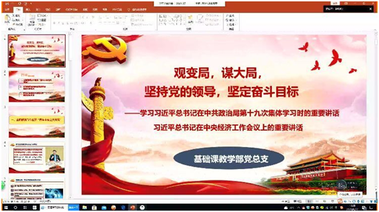 为贯彻我校“十三五”事业发展规划、加强领导干部理论学习、强化理论武装,根据中央和省、市委部署要求,依据无锡《2020年全市县以上党委(党组)理论学习中心组专题学习计划》(锡宣通〔2020〕5号)精神,结合无锡太湖学院基础课教学部实际,2020年8月27日下午1:30,基础课教学部党总支马克思主义学院党支部宣传委员张虹老师作为专题六——关于“百年未有之大变局”的专题学习重点发言人,带领中心组进行了集体线上学习,会议由马克思主义学院党支部组织委员孙艳艳老师主持并总结。