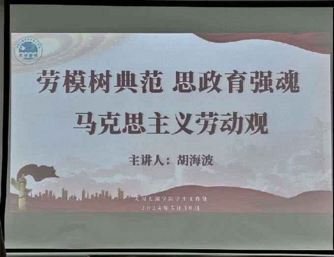 5月30日上午,无锡太湖学院主办的“劳模树典范 思政育强魂”系列讲座在工科实训大楼B316举行。江南大学思想政治理论课特聘教授、东北师范大学马克思主义学院胡海波教授受邀作题为《马克思主义劳动观》的专题讲座。