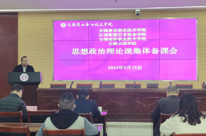 本次集体备课会以《习近平新时代中国特色社会主义思想概论》课程建设为切入点,四校马克思主义学院教师代表分享了院校思政课的宝贵经验。江苏省习近平新时代中国特色社会主义思想研究中心江南大学理论研究基地执行主任刘焕明教授作了题为《习近平文化思想的继承性和创新性》的讲座,介绍了江南大学新思想的课程开设与教学单元设计等情况。江南影视艺术职业学院副院长兼马克思主义学院副院长曹建林教授介绍了本校新思想课程的建设情况。无锡南洋职业技术学院马克思主义学院院长王靖教授从“感谢”、“学习”、“精进”三个关键词展开交流。会上,无锡商业职业技术学院马克思主义学院概论课教研室主任帅秋萍,以《点绿成金:两山理论的科学内涵》为题,为在座教师展示了一堂精彩生动的思政课教学示范课。